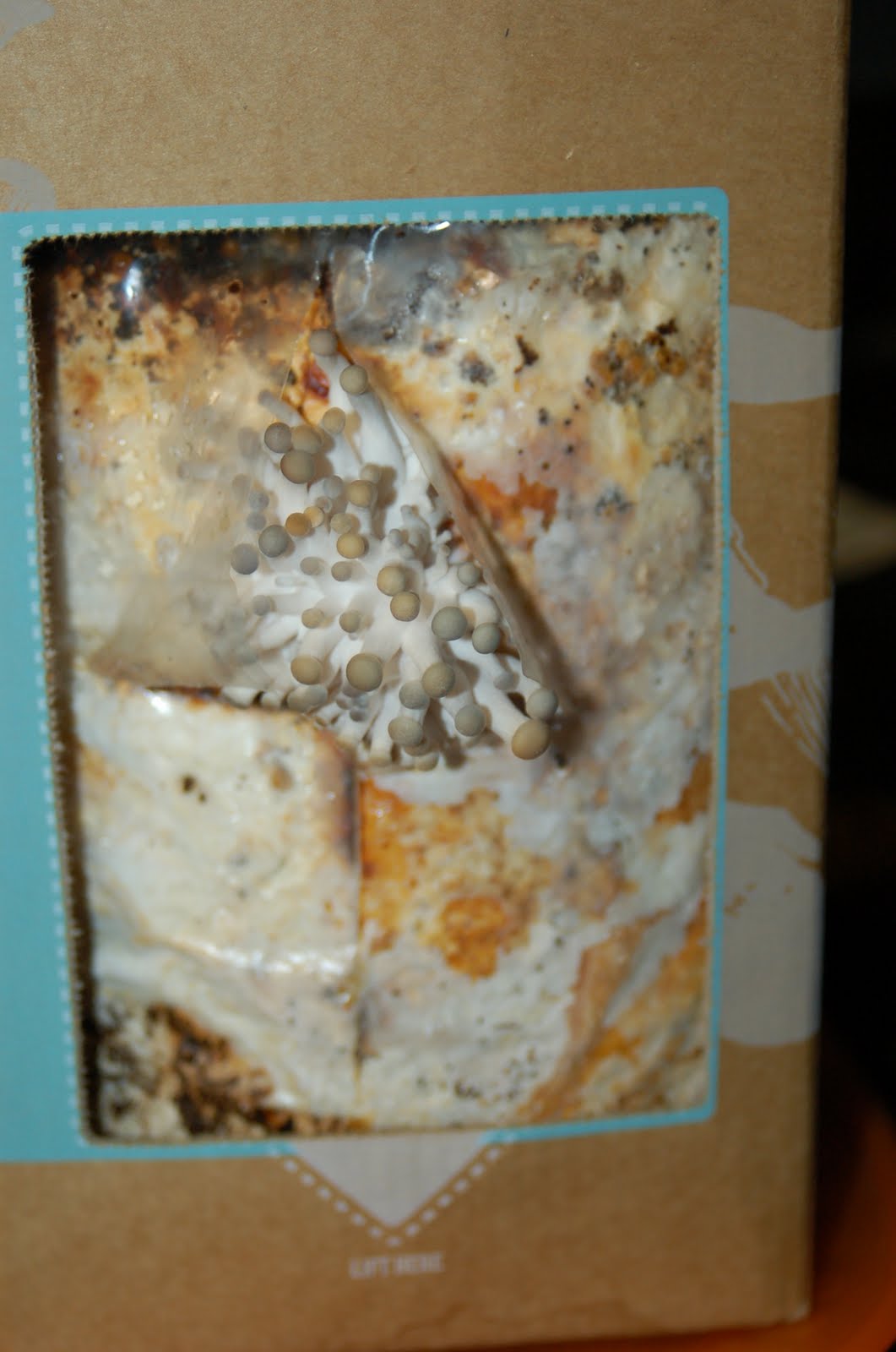 Once you receive your mushroom kit in a box, you simply pop out the perforated windows on the front and back of the box and pull out the bag of (gross-looking!) mushroom/coffee mix! You’re supposed to soak it for 24 hours in a container of water- we used a small (clean) trash can and then weighted it down with a glass plate since the package floats. Once 24 hours has passed all you do is pull out the bag of mushroom mix, make a cross shaped slit in the front and back of the bag, and insert it right back into that cardboard box! Caring and growing your mushrooms is SO incredibly easy! All you do is mist it twice a day. That’s it! To be honest I’m pretty sure we either misted it too much or not enough every day and our mushroom kit grew like a weed!