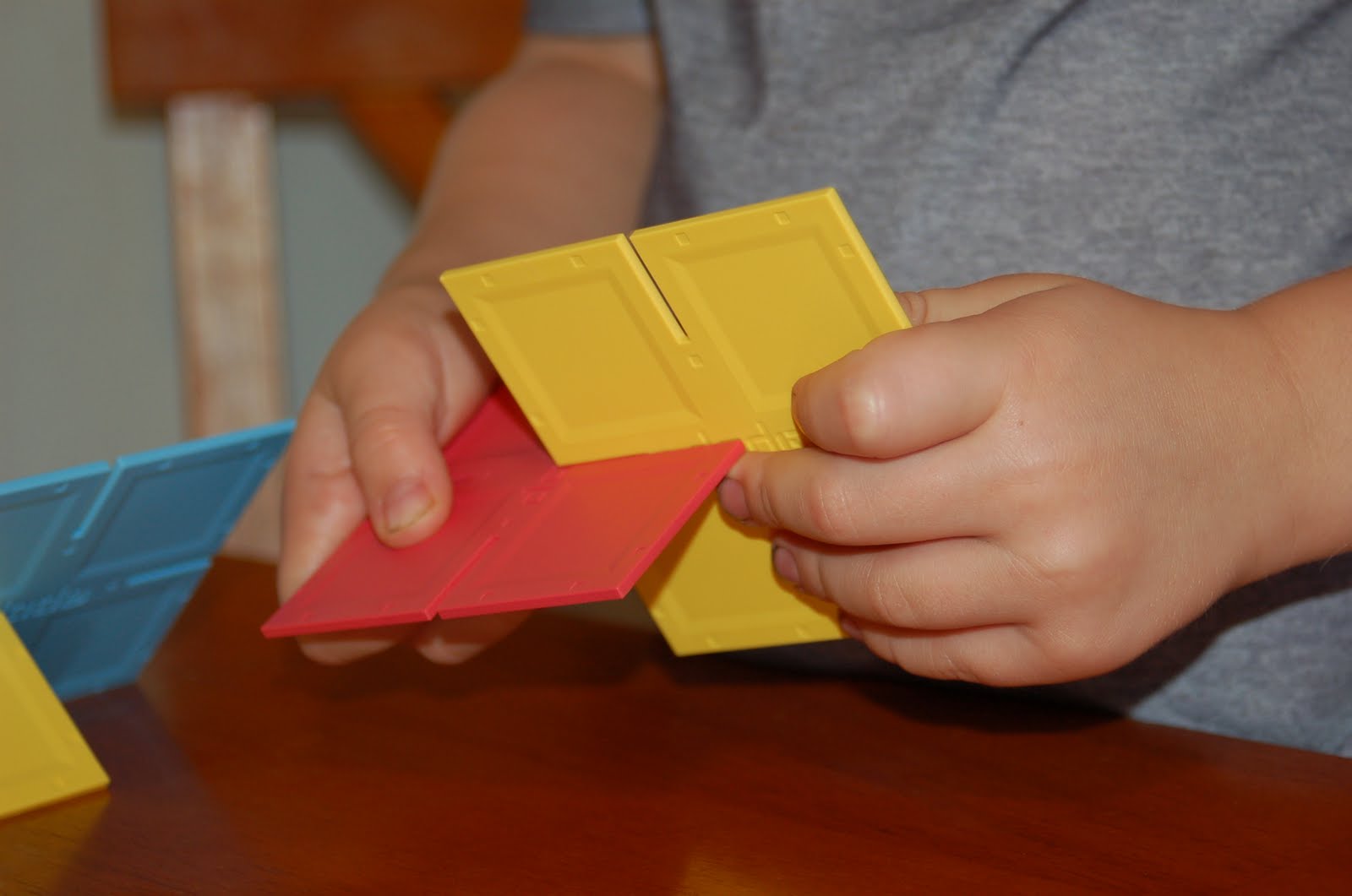 You may be thinking- what in the world is that? These are Dado Squares from the Fat Brain Toy Company! They are 3″ heavy duty plastic squares made in the USA which have slits on all four sides. Simply, you just slide the slits of the squares together and voila- you’ve made a new creation! Slide a few more slits together on these squares, and the possibilities are endless!