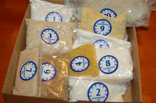 The materials in this Finger Paint Sensation Kit by Roylco come in separately numbered bags which makes it easy to tell the materials apart. I love the large numbers on the front – it helped me find which material I was looking for easier! Each bag has a different material to mix in your paint which will produce a different texture. Since my children are young we used washable paint. This kit includes textures for the following sensations: