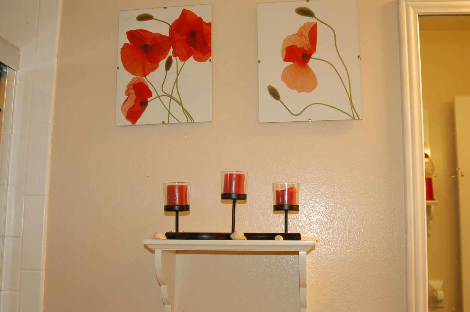 If I had tons of money I would certainly decorate my house differently, but then again, I probably wouldn’t have this blog either! 😉 But you can still decorate on a small budget. Above I bought the pictures with frames at IKEA and Target for about $2.50. The candles were a gift, and the shelf was there when we moved in.