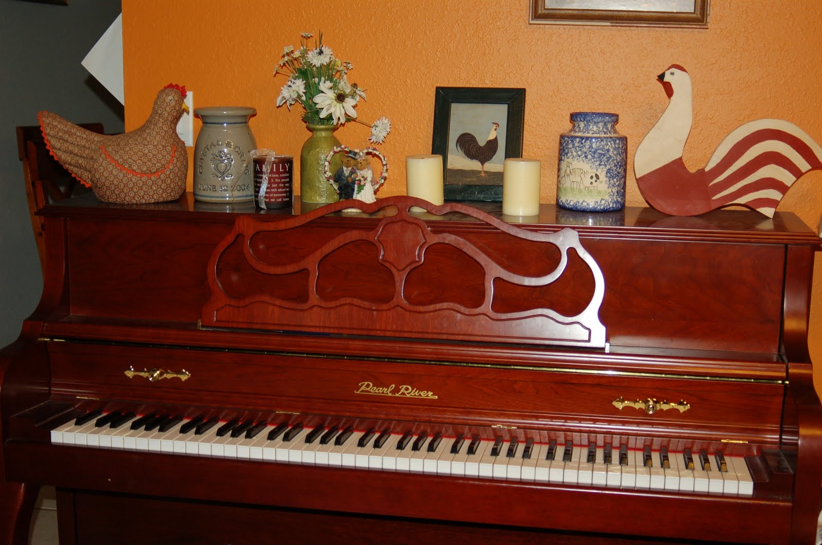 My piano is in my living room – as is all of our kids toys and DVD’s which take up a LOT of room. To be honest the kids area is always pretty messy so I enjoy having a section of the room that is decorated yet uncluttered. The top of my piano could actually have about half that amount of stuff and look much nicer, but it is all sentimental. Figurines and pottery from our wedding, etc. A nice crisp clean uncluttered area in a main social gathering room catches your eye.