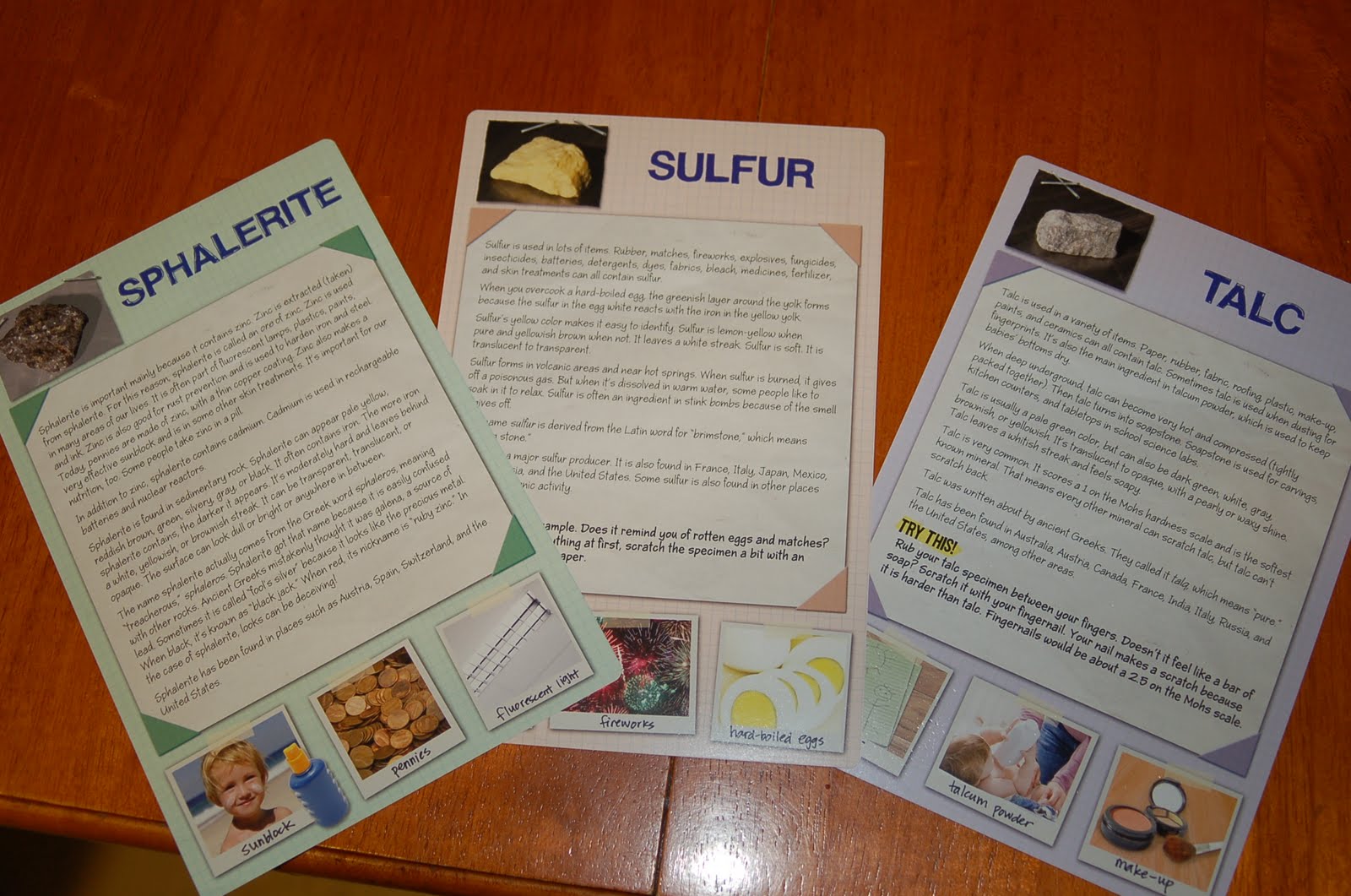Also in the box are 12 large 9″x6″ identification cards that not only include the names and pictures of each rock in the kit, but on the front of the card there is a quick reference picture for what each rock can be used for. On the back of the card there is more interesting facts about the rock, the colors it can come in, what it can be used for, where it can be found, interesting tidbits, and some of them even have a “TRY THIS!” section for the kids to actually interact with the rock by moistening it, smelling it, etc.