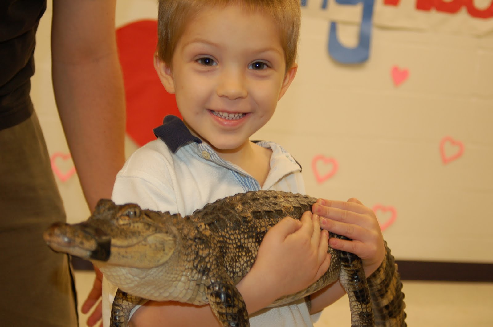 Although the students were not allowed to touch the animals- any brave teachers could touch them! Although most of the teachers were too busy monitoring their classes, Mr. I snuck back on stage and was thrilled with the opportunity to hold the alligator!