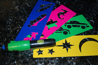 The fun Glow Crazy box you see above contains 1 light wand, 2 very large wall clings (12″x30″ each!), 4 stencil sheets, and a fun tips booklet. The light wand does not come with the 4 ‘AAA’ batteries that it needs to work-so make sure you have some on hand when you get yours! The stencils you see below contained a transportation theme (truck & 2 cars), a space theme (rocket ship, alien ship, and fire bolt), a celestial theme (moon & stars), and an underwater theme (fish, seahorse, & turtle).
