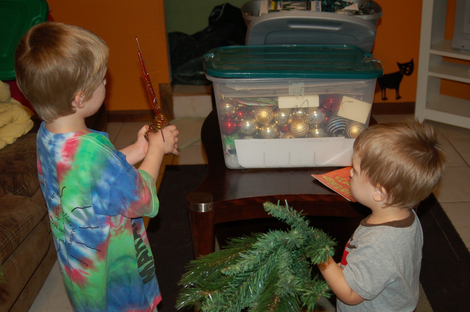 As my husband and I were putting the tree together the boys eagerly eyed the ornaments which are the last to be pulled out around here.