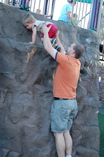 So when my son, who had just turned 3 years old wanted to rock climb at our family reunion this summer- what do you think I told him? SURE! BUT only have making sure he met the minimum safety requirements and had daddy go along next to him. Can you even see him in this picture below? He is all the way up at the top with his daddy.