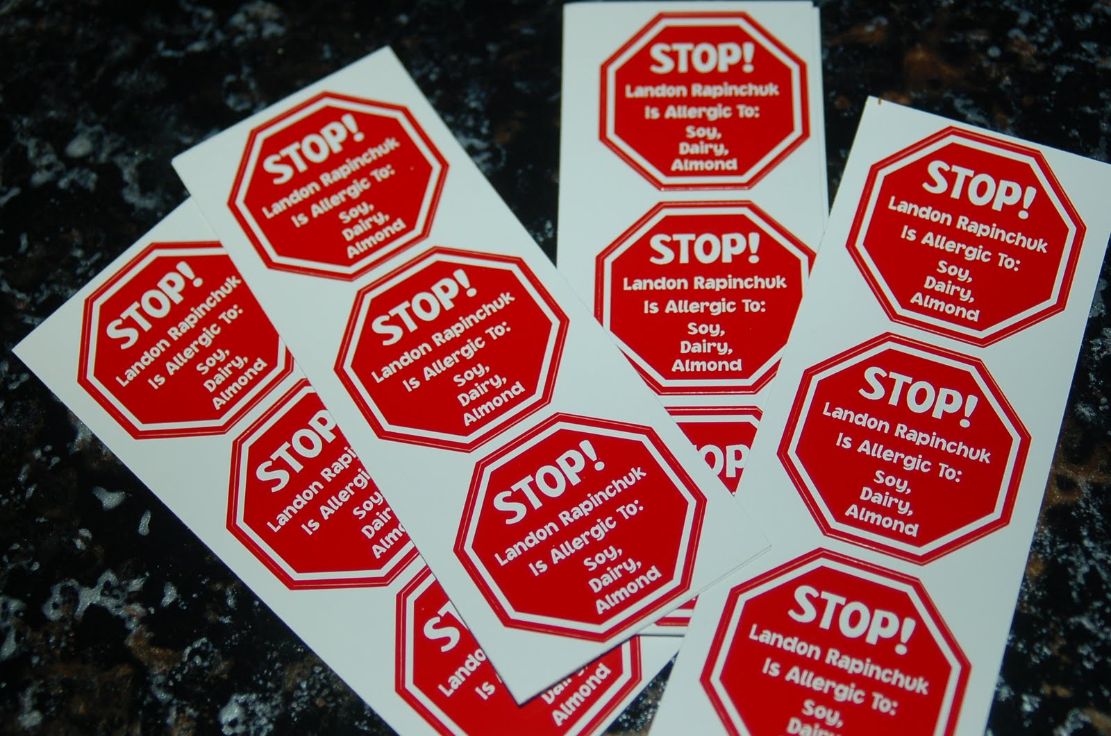 I was impressed at these labels. They are VERY nice and certainly do stay put! No peeling or slipping, and my kids can’t seem to pull these labels off. The bright red STOP! sign certainly will make someone look twice at the sticker. All of the Allergy Alert labels have my son’s name on them, and says that he is allergic to Soy, Dairy, and Almond. If your child goes to a church nursery, daycare, or school- it doesn’t matter how many times you tell their workers that your child has an allergy- eventually they will forget. In fact when I drop my son off at his church nursery on Sundays I remind them EVERY single week of his allergies, and would you believe that every week for months my son would come home with allergy rashes and digestive problems. EVERY single week. These stickers are a visual reminder for caregivers that they can’t miss to remind them of your child’s allergy.