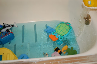 My kids have always loved bath time since day 1, but this is a great idea if your child is leery of the bath. When my oldest son was 1 year old and we wanted to do something fun I would offer for him to take an Ocean Bath, or even a Monster Bath! All you need is food dye! Just run their bath water like you normally would, and add about 10 drops of food coloring in it! (No- it won’t turn their skin colors!! It’s too diluted for that.) And voila- a fun bath! For an ocean bath just add blue food dye & animal toys as seen below….. for a monster bath add green food dye, etc. I think we even did an “elmo bath” with red dye once… Make up your own type of bath depending on what your child is obsessed with at the moment! This picture is of a very light colored bath. I have done colors so dark you can’t see to the bottom and my son has never gotten stained!