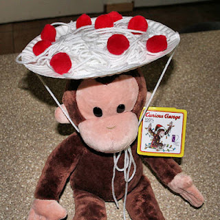Oh how fun! I found this adorable Spaghetti and Meatballs Hat craft which would go great with any Curious George book or activity on Family Crafts and all you need is a paper plate, yarn (white), pom pom balls (red), glue, scissors, and a hole punch!! This is a neat idea for a silly craft, or to go along with a story book or song! Simply punch a hole on either side of your plate (2 holes total across from each other). Dip your “spaghetti” yarn in glue and start piling it onto the plate! Glue the red “meatball” pom poms on, and string some yarn through the holes to tie onto a child or stuffed animal’s head!