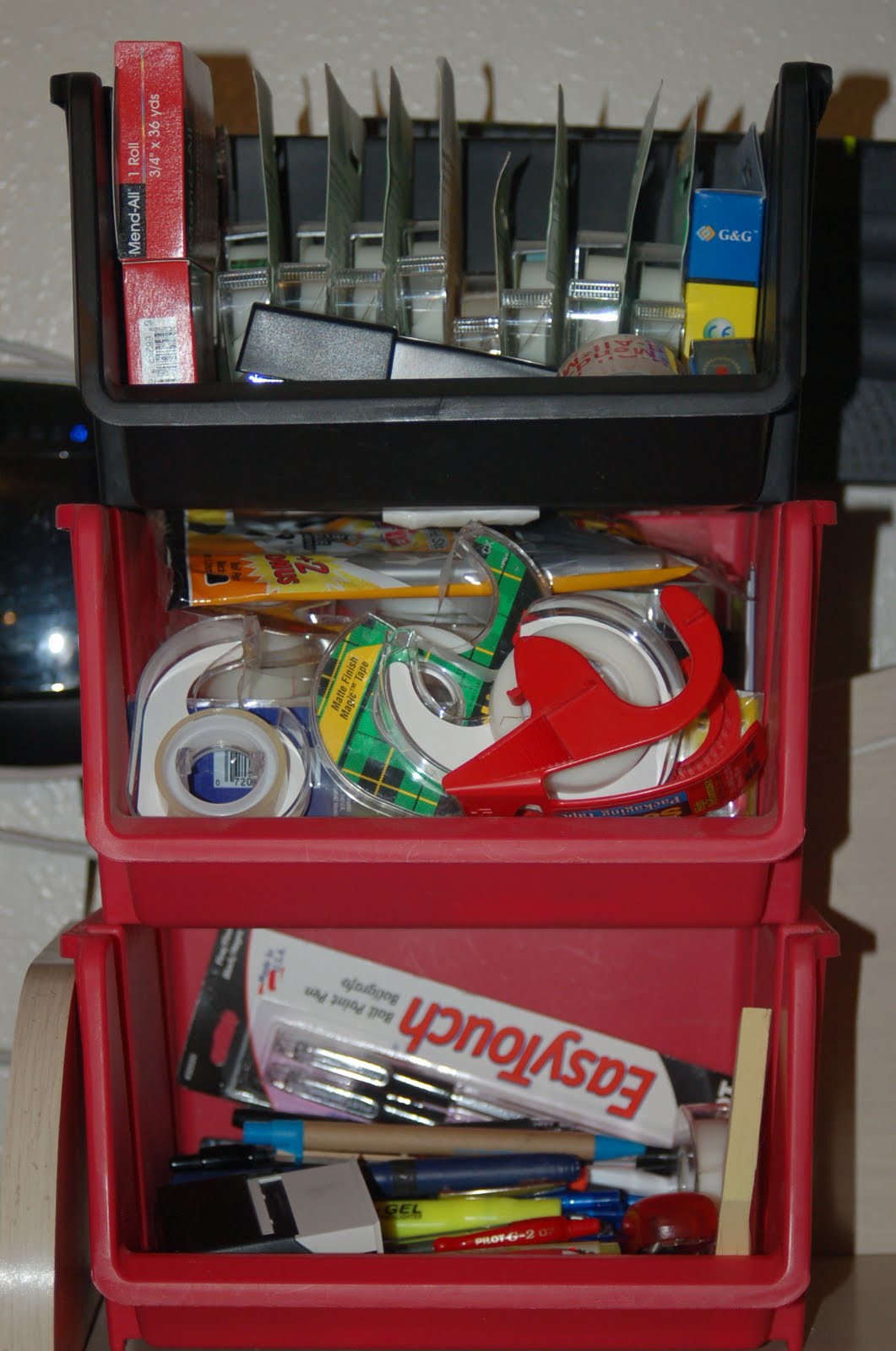 I mentioned these stacking containers yesterday, but we these block the cable modem hanging on the wall and also hold our pens, pencils, tape, and other office supplies that I need to have handy. They cost $1 for each bucket at the Dollar Tree. I like the fact that everything is very easy to grab when needed, but I don’t care for the fact that you can plainly see everything in them.