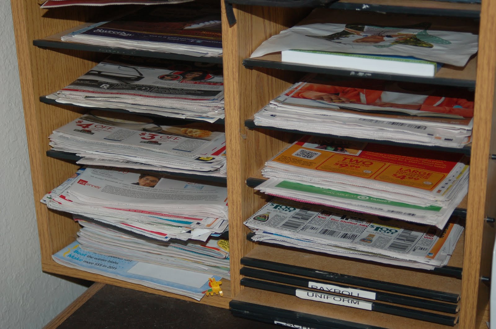 Quite some time ago I was looking for these mail slot organizers which are incredibly expensive! Wow! I did not realize how expensive they were!! I thought this would be a good way to organize our coupon inserts since we coupon to save money on our groceries. After a few months of looking around I happened to find this one for $2 at a yard sale! A few weeks later I even saw one laying on the side of the road that someone was throwing away! So keep your eyes peeled. You never know when you will find something you can use.