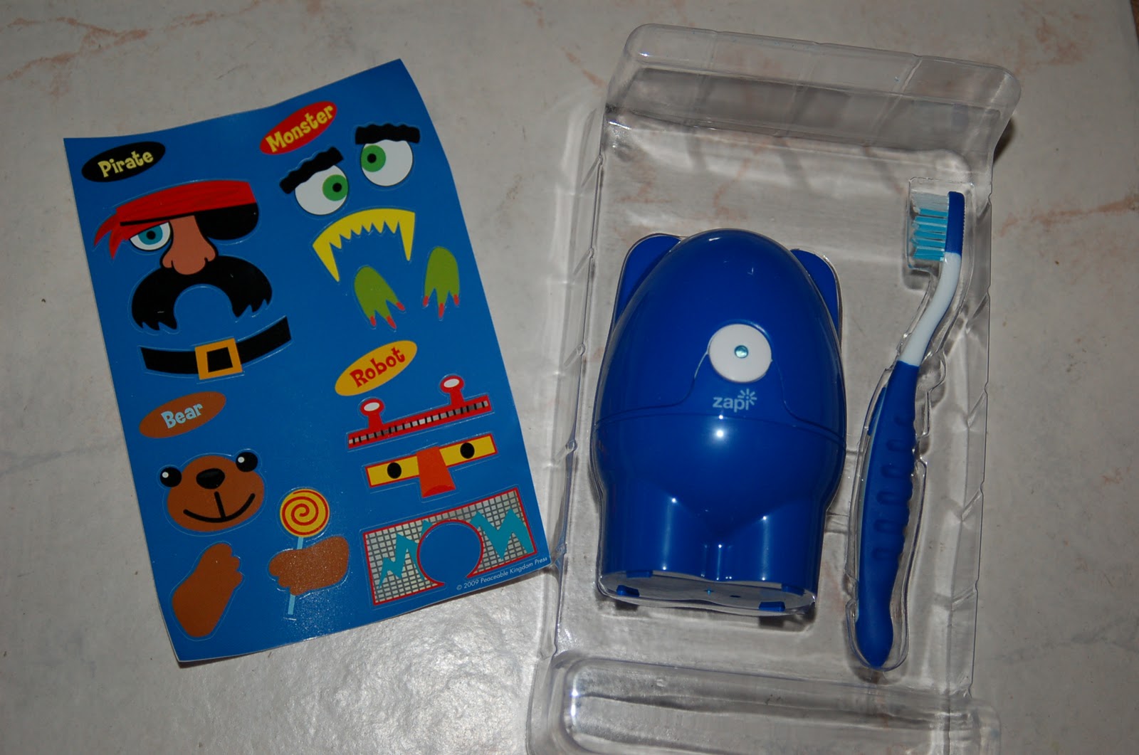 Zapi-Doodle lets kids get creative with fun removable stickers. You can place them anywhere! The blue Zapi Doodle includes decals for friendly pirates, cute monsters, a teddy bear, and even a robot! (The pink one has princess, kitty, & bear stickers.) My son has gone absolutely crazy over his pirate Zapi Doodle. We told him when we received his Zapi Doodle that he could only use it after he brushes his teeth. He now brushes his teeth at least 5 times a day. I actually have to tell him “No- you can’t brush your teeth AGAIN- you just want to use your Zapi Doodle!” I am honestly amazed at how much my son LOVES his toothbrush sanitizer!