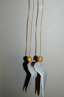 It’s very simply just a few wooden beads, a string and a styrofoam plate cut out in pie-shaped pieces.